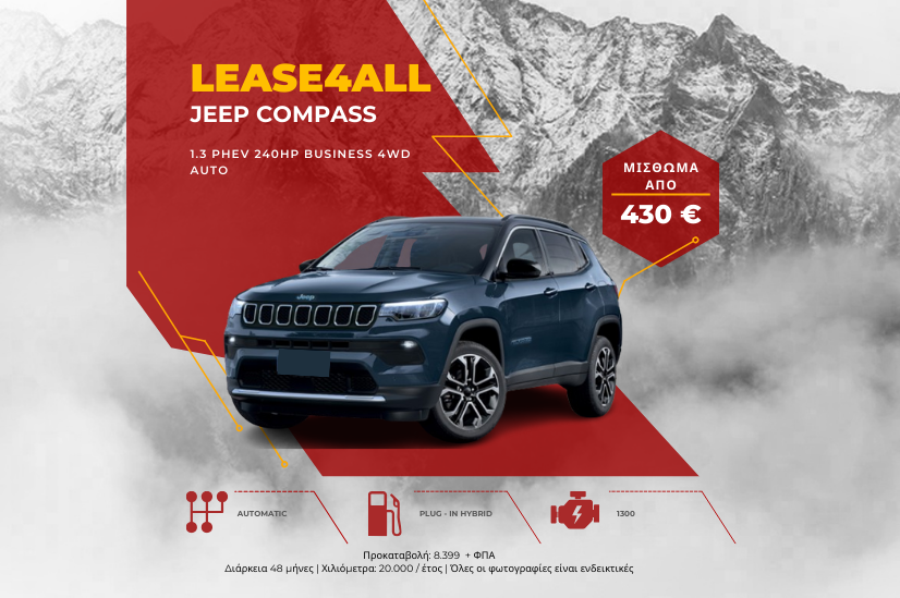 Το Compass 1.3 PHEV 240hp Business 4WD Auto είναι κάτι περισσότερο από ένα απλό όχημα- είναι μια δήλωση στυλ και ικανοτήτων. Η επιβλητική παρουσία του στο δρόμο συνδυάζεται μόνο με την ευελιξία του, μεταβαίνοντας απρόσκοπτα από την αστική ζούγκλα σε δύσβατα εκτός δρόμου εδάφη.