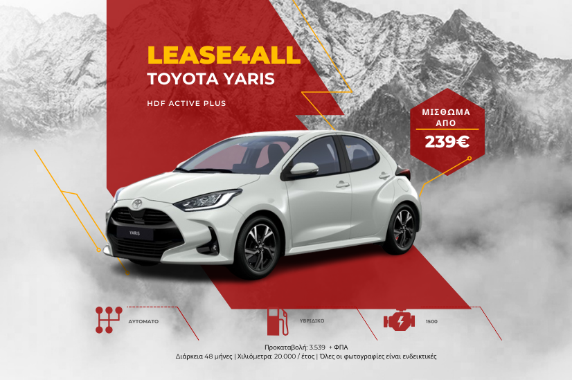Ανακαλύψτε το TOYOTA YARIS HDF Active Plus, το ιδανικό αυτοκίνητο για την πόλη και όχι μόνο. Με σύγχρονη σχεδίαση, οικονομικό και ισχυρό κινητήρα HDF, και προηγμένα συστήματα ασφαλείας Toyota Safety Sense, προσφέρει άνετη και ασφαλή οδήγηση. Εξοπλισμένο με σύστημα πολυμέσων, Apple CarPlay, Android Auto και ενσωματωμένο σύστημα πλοήγησης, το Yaris HDF Active Plus συνδυάζει άνεση, τεχνολογία και αξιοπιστία Toyota, καθιστώντας το την τέλεια επιλογή για κάθε διαδρομή.